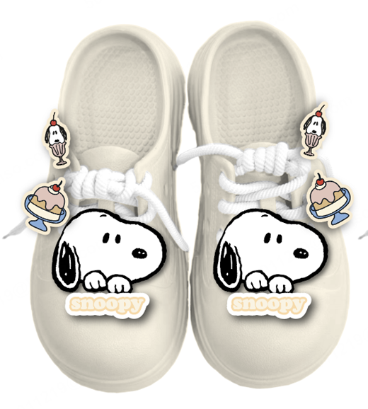Design: Fun Snoopy-themed clogs with lace-up detail.