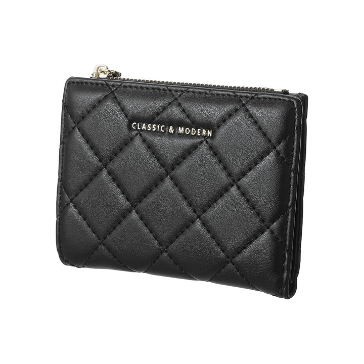 Women's Short Diamond Lattice Pattern Quilted Wallet with Golden Letters(Black)